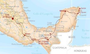Continuación en dirección a Campeche, la ciudad española más antigua de Yucatán, único puerto de intercambio de los productos de la región. Fundada en 1540 por Francisco de Montejo, apodado El Mozo, está situada en una costa plana, frente al mar abierto y, por lo tanto, muy expuesta a los ataques de los piratas: por ello, fue rodeada por murallas de 8 m de altura, protegida por fortificaciones y baterías costeras, de las cuales quedan algunos tramos aún visitables hoy en día.
